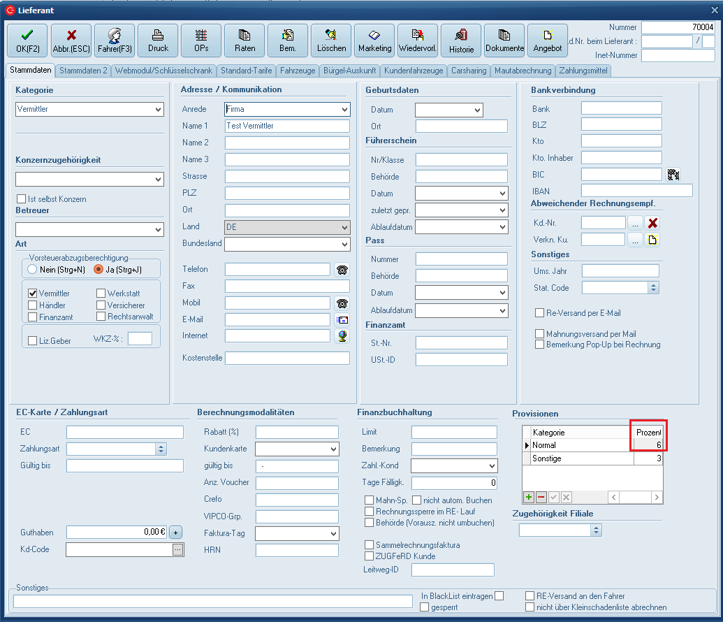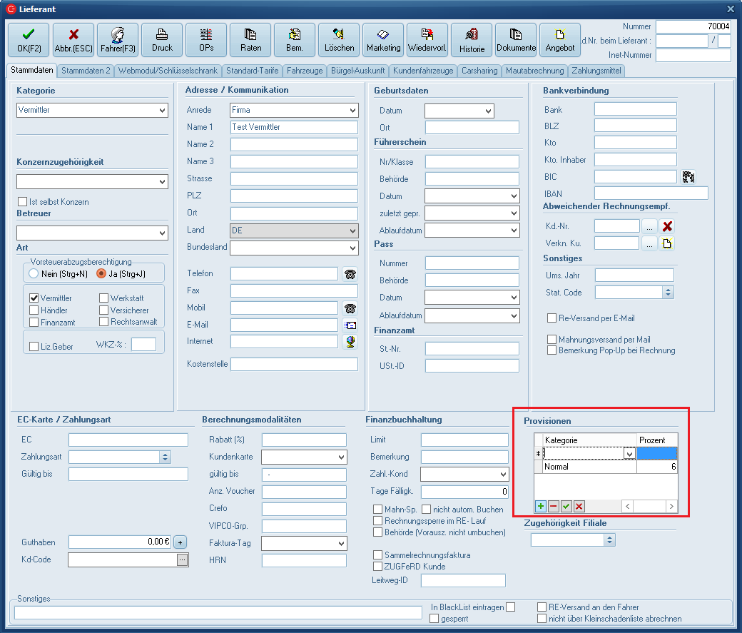 Die Provisionen können hier eingetragen werden.