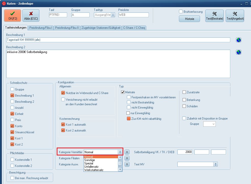 In den Tarifeinstellungen muss unter "Kategorie Vermittler" die entsprechende Provisionskategorien zugeordnet werden. Die Eingabe wird automatisch in alle dem Tarif zugehörigen Gruppen übernommen.