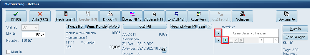 Sie haben auch die Möglichkeit, mehrere Vermittler zu hinterlegen. Das Hinzufügen mehrerer Vermittler unterscheidet sich nicht von der Anlage eines einzelnen Vermittlers. Wenn Sie sich in der Mietvertragsmaske befinden klicken Sie im Feld "Vermittler" einfach auf "+" und fügen einen Vermittler hinzu. Wiederholen Sie nun die Schritte so oft, bis Sie alle gewünschten Vermittler hinzugefügt haben.