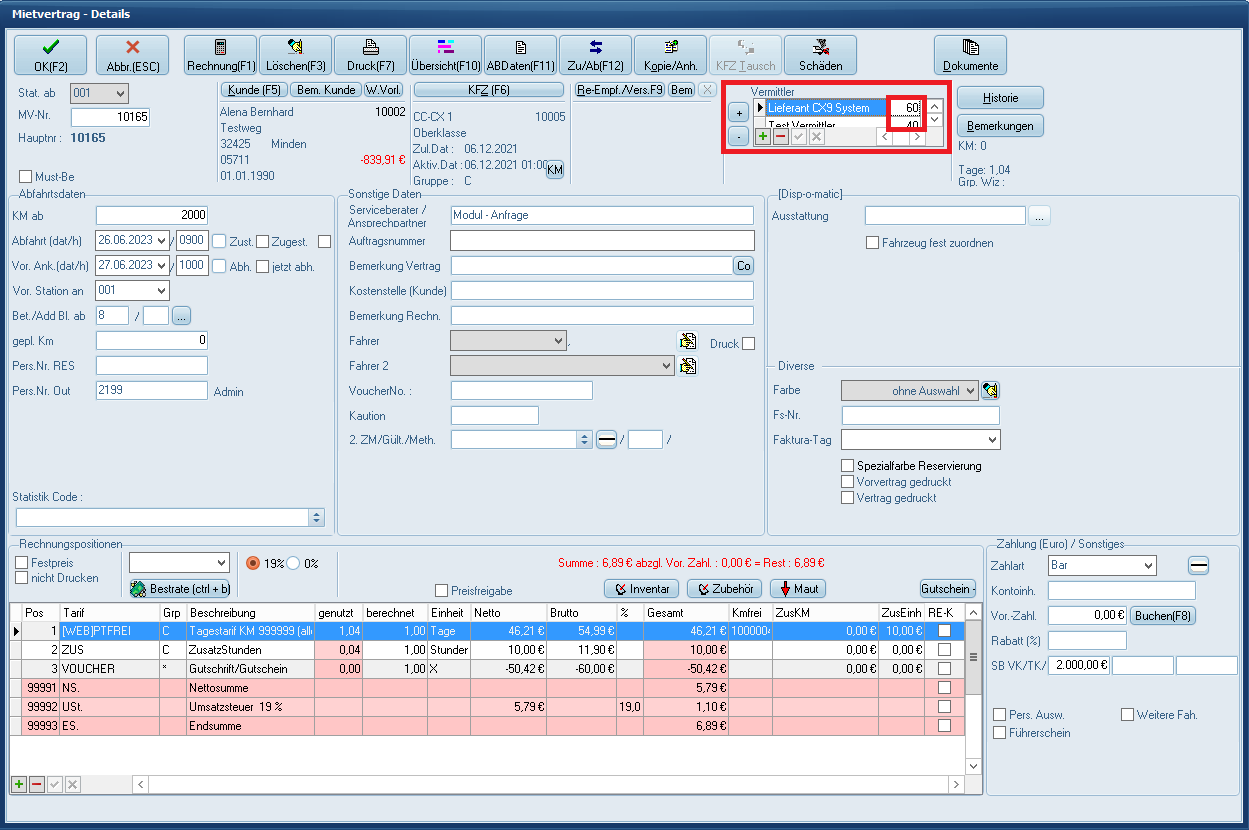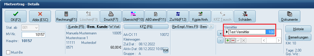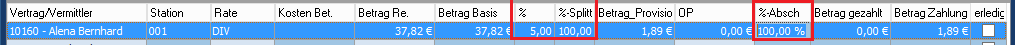 Im Vertrag wird nun der Vermittler angezeigt, rechts daneben "100".