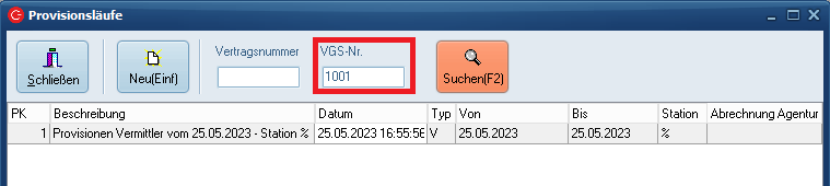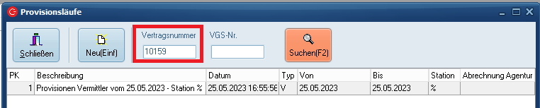 Hier finden Sie schon angefertigte Provisionsläufe aufgelistet vor. Sie haben hier die Möglichkeit, gezielt nach bestimmten Provisionsläufen zu suchen. Als Suchparameter stehen Ihnen hierbei Vertrags- und VGS-Nr. zur Verfügung.