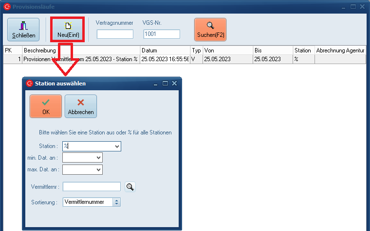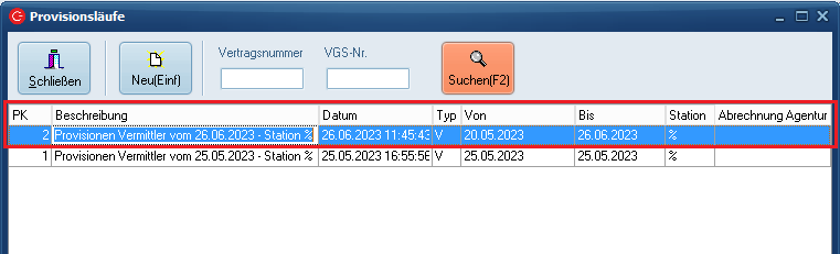 Um einen neuen Provisionslauf zu erstellen, klicken Sie auf den "Neu"-Button oder betätigen die "Einfg"-Taste auf Ihrer Tastatur.