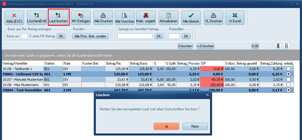 Löscht den gesamten erstellten Lauf mit allen Vermittlergutschriften.