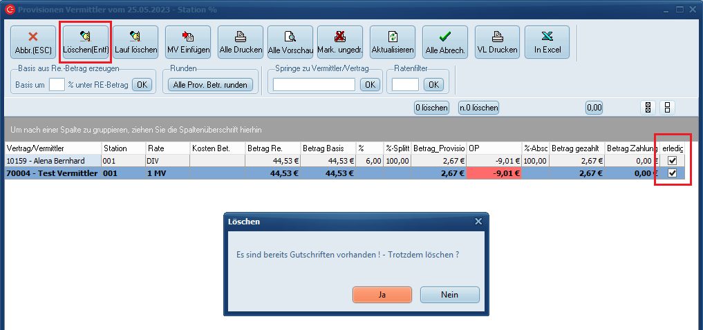 Ist der Lauf bereits abgerechnet worden erscheint ein zusätzlicher Warnhinweis. Die Zeile kann aber trotzdem gelöscht werden. Wir empfehlen hier allerdings nicht, da die Vermittlergutschrift hierzu nicht automatisch gelöscht/angepasst wird.