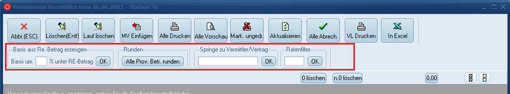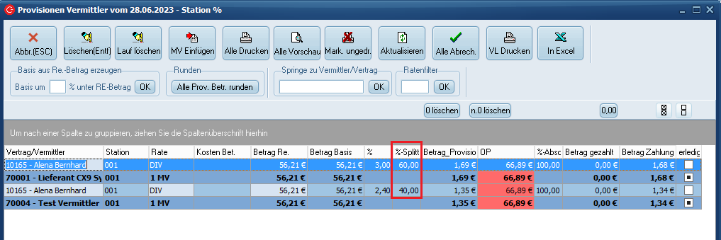 Da aber in der Mietvertragsmaske angegeben wurde, dass er nur 60 % erhalten soll, erhält dieser Vermittler lediglich 60% dieser 2,81€, was 1,69€ wären. Dies wären 3 % des RE-Betrags. Diesen Wert können Sie auch im Feld "%" ablesen.
