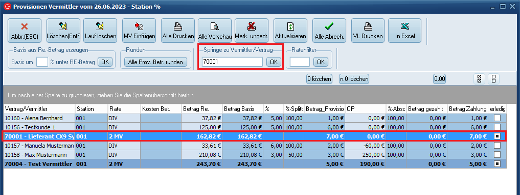 Über dem Vermittler finden Sie -hellblau hinterlegt- die Verträge, für welche er eine Provision erhalten soll.