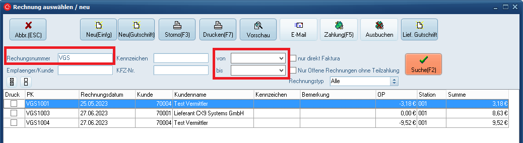 Alternativ können Sie Vermittlergutschriften auch über den C-Rent Reiter Verkauf > Rechnungen > Neu / Ändern suchen. Geben Sie hierzu im Feld Rechnungsnummer "VGS" ein und schränken Sie den Datumsbereich ein.