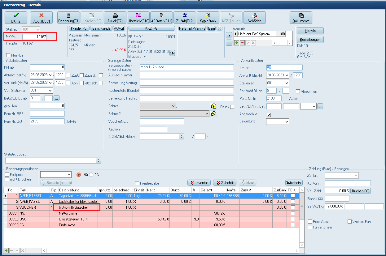 In der Provisionsabrechnung wird nur der Vertrag 10167 mit Gutschein berücksichtigt. Vertrag 10166, mit Rabatt, wird korrekter Weise nicht angezeigt.