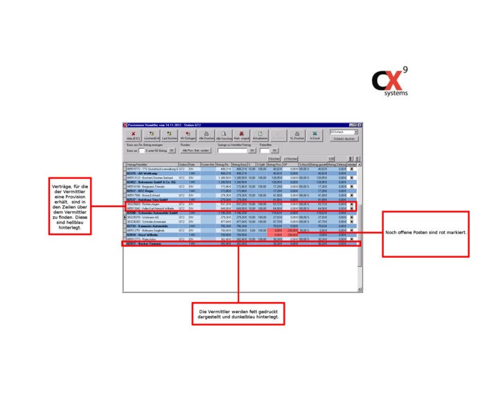 Über dem Vermittler finden Sie -hellblau hinterlegt- die Verträge, für welche er eine Provision erhalten soll.