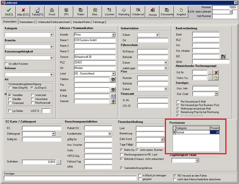 Hier wird der Provisionssatz angezeigt, der unter "Provisionskategorien" angelegt und im Tarif hinterlegt wurde.