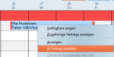 Soll nun die vorhandene Reservierung in einen Mietvertrag gewandelt werden, genügt ein Rechtsklick auf die entsprechende Reservierung. Wählen Sie nun "In Vertrag wandeln".