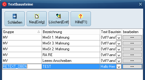 Anlegen von Textbausteinen