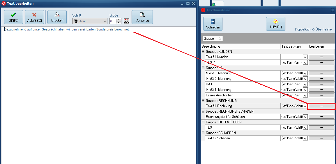 Sie können nun mittels Doppelklick im linken Bereich auf einen Textbaustein diesen im rechten Bereich in den Brief einfügen.