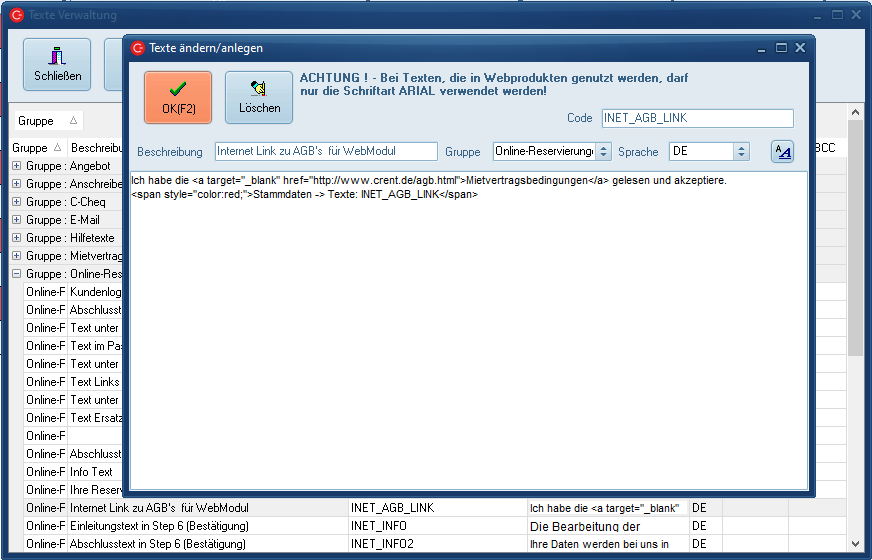 Zur Anlage von individuellen Texten für Reservierungsbestätigungen, Anschreiben an Versicherungen etc. kann diese Textmaske genutzt werden.