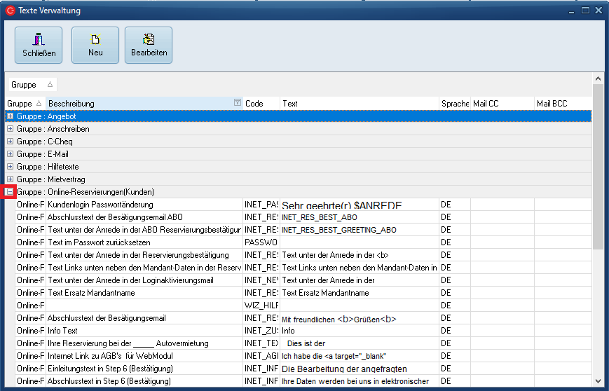 Wie Sie sehen, sind die einzelnen Textvorlagen in Gruppen unterteilt. Um die einzelnen Einträge einer Gruppe anzuzeigen, klicken Sie auf das "