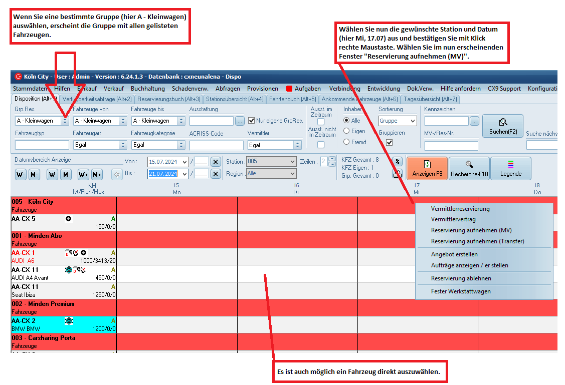 Möchten Sie eine Gruppenreservierung vornehmen, weil der Kunde z.B. keine spezifischen Wünsche bezüglich des Fahrzeugtyps hat und nur einen Kleinwagen ordern möchte oder Sie noch nicht wissen, ob ein spezifisches Fahrzeug während des gewünschten Zeitraums zur Verfügung steht, können Sie eine Gruppenreservierung durchführen. Dazu wählen Sie einfach unter dem Reiter "Grp.Res." die passende Gruppe (in diesem Fall A-Kleinwagen) aus. In der Dispo erscheint nun die Gruppe samt der Stationen und der verfügbaren Fahrzeuge.