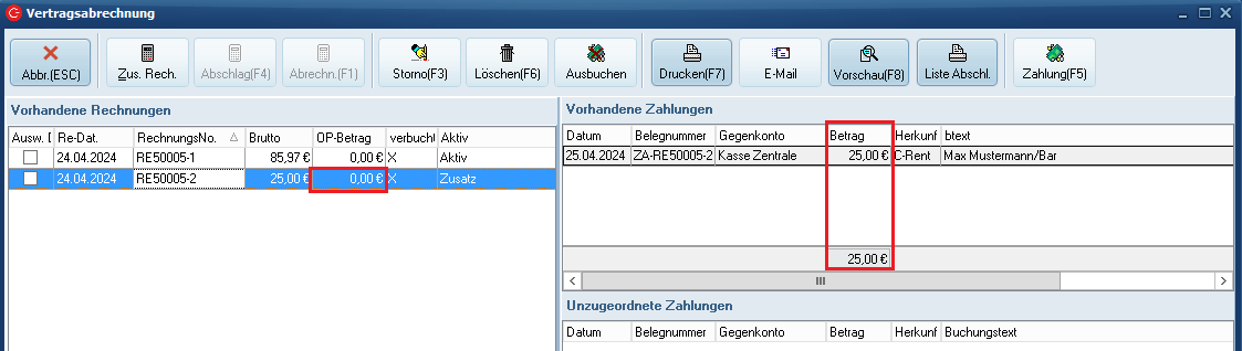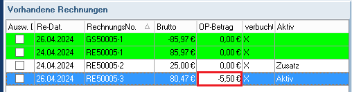 In diesem Fall sind der neuen Rechnung die Zahlungen/Verrechnungen aus der ersten Abrechnung sowie die aktuelle Zahlung (5,50 €) zugeordnet. Die Rechnung ist somit also ausgeglichen.