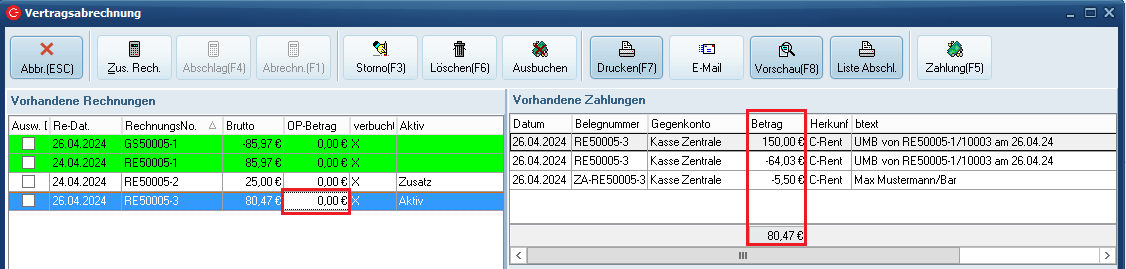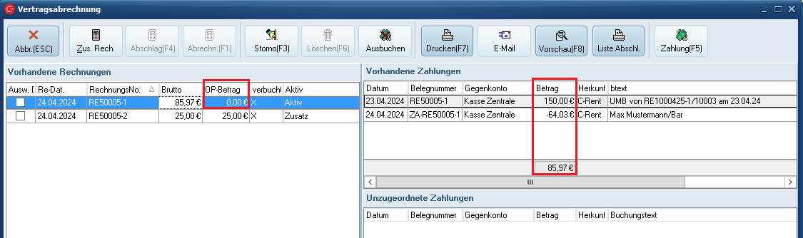 Dem folgenden Beispiel liegen die Abrechnung des Mietvertrags sowie eine Zusatzrechnung zugrunde. In der ersten Abbildung wurde die Mietvertragsrechnung über 85,97 € angewählt, welcher eine Einzahlung über 150 € sowie eine Auszahlung über 64,03 € zugeordnet sind. Der Rechnungsbetrag ist also in voller Höhe ausgeglichen, es besteht keine Differenz. Der OP dieser Rechnung wird entsprechend mit 0,00 € ausgewiesen.