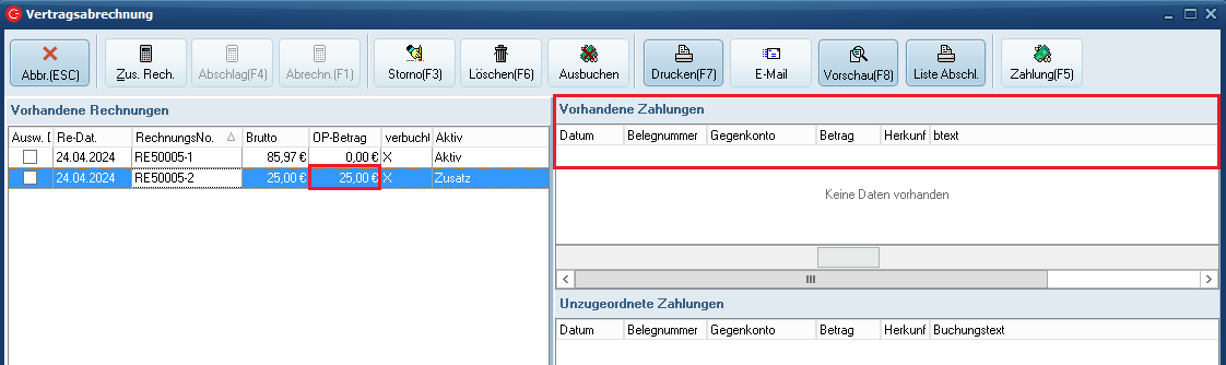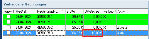 Der Zusatzrechnung wurde nun ebenfalls eine Zahlung zugeordnet und der OP ist daher ausgeglichen.