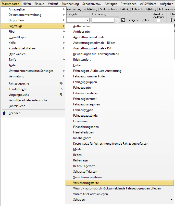 Als erstes geht man dazu in die Verischerungstarife. Diese Findet man wie im Screenshot zu sehen unter "Stammdaten->Fahrzeuge->Versicherungstarife"