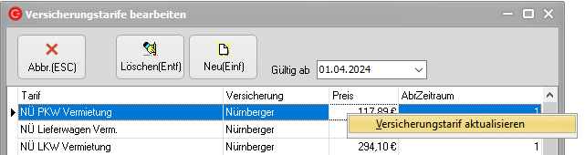 Wenn das erfolgt ist, klickt man mit der rechten Maustaste auf den Versicherungseintrag und klickt im Anschluss auf den Eintrag "Versicherungstarif aktualisieren".