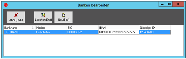 Unter Stammdaten > Unternehmensstruktur/Sonstiges > Bank muss eine Bank angelegt sein.