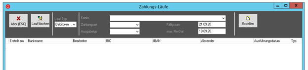 Über den Reiter „Buchhaltung“ gelangen Sie über Klick auf Zahlläufe, in die Maske „Zahl-Läufe“.