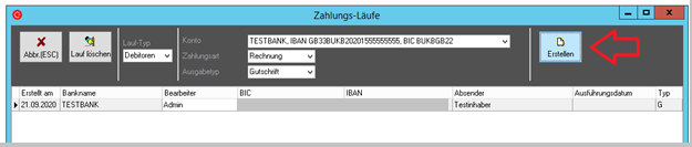 Per Klick auf den Button „Erstellen“, wird der Zahllauf erstellt. Hier im Beispiel mit Typ Gutschrift.