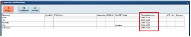 • Rate für Ausbuchungen unter "Stammdaten -> Fahrzeuge -> Fahrzeugarten" hinterlegen.