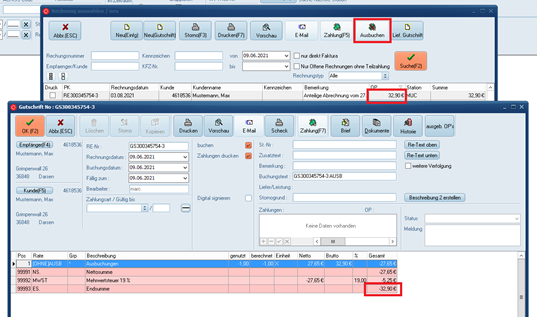 Im Anschluss wird eine Gutschrift mit der Rate „AUSB“ über den OP Betrag erstellt. Sie können die Gutschrift bei Bedarf noch Anpassen und mit „OK“ speichern.