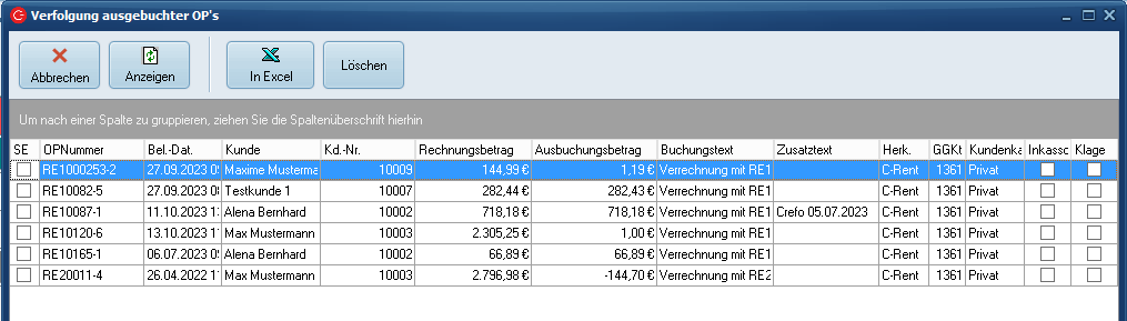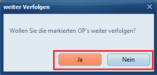 Klicken Sie auf den Button „Ausbuchen“. C-Rent fragt zunächst, ob Sie die markierten OP's weiter verfolgen möchten, bestätigen Sie mit Klick auf Ja oder nein.