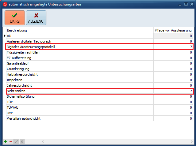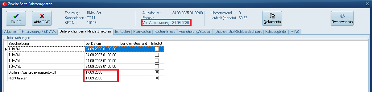 Es wurde eine Tabelle geschaffen in der Untersuchungen mit X Tagen vor dem Aussteuerungstermin automatisch zum Fahrzeug hinzugefügt werden können.