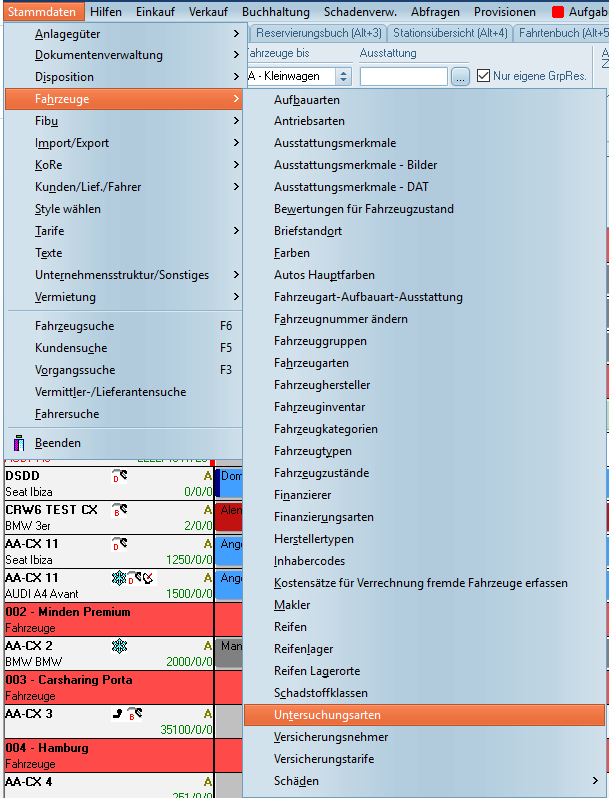 Über Stammdaten/Fahrzeuge/Untersuchungsarten lässt sich die folgende Maske öffnen.