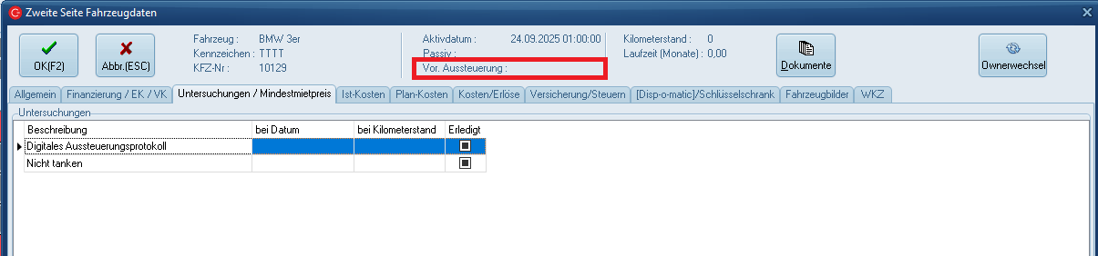 Sobald die vor. Aussteuerung befüllt wurde werden, wie gewohnt, die Termine für TÜV/AU automatisch erstellt. Der Vorgang muss nun einmal gespeichert werden. Bei erneutem Aufruf der Maske sind die Datumsfelder nun befüllt: