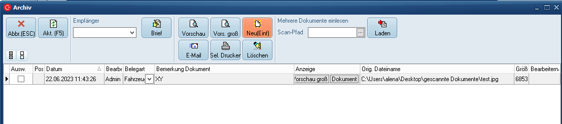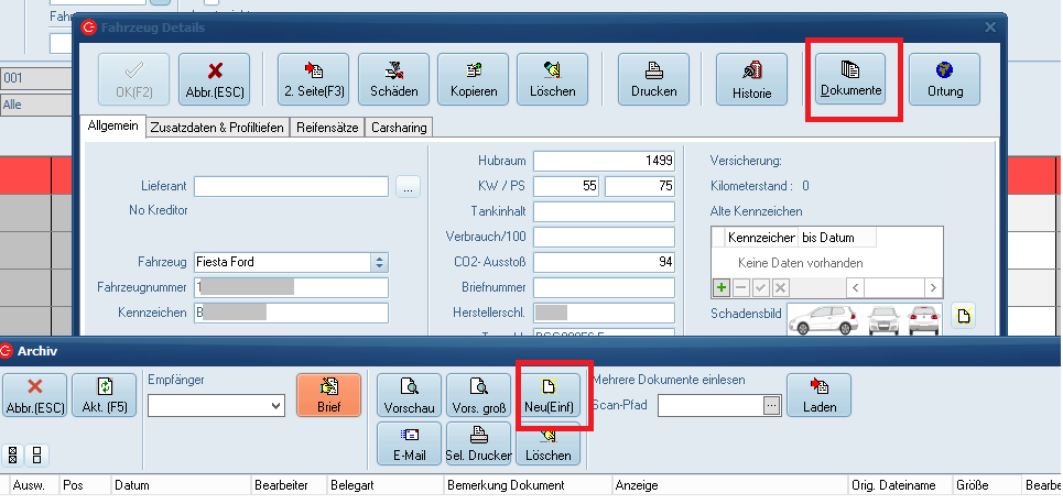 Suchen Sie das gewünschte Fahrzeug und gehen Sie über den Fahrzeugstamm auf die Dokumente/das Archiv. Klicken Sie auf den Button "Neu(Einfg)".