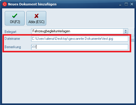 Unter Dateiname wird nun das von Ihnen ausgewählte Dokument angehängt, optional ist das hinzufügen einer „Bemerkung“ möglich.