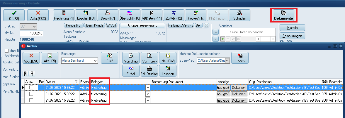 Die im Vertrag (Reservierung oder Mietvertrag) eingescannte Dokumente werden automatisch der Belegart "Mietvertrag" zugeordnet. -