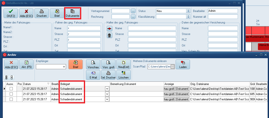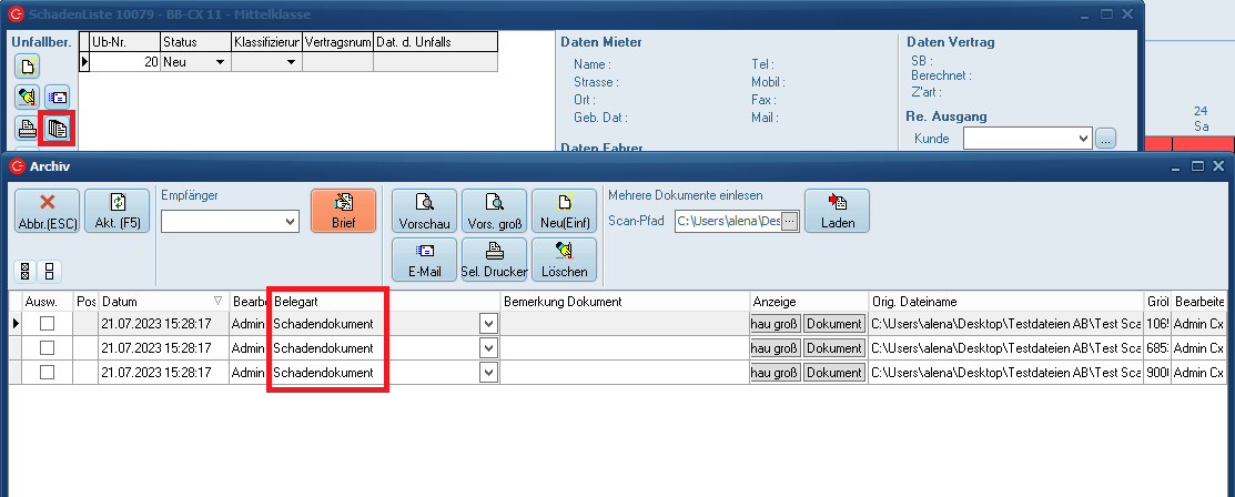 Die in folgenden Masken eingescannte Dokumente werden automatisch der Belegart "Schadendokument" zugeordnet.