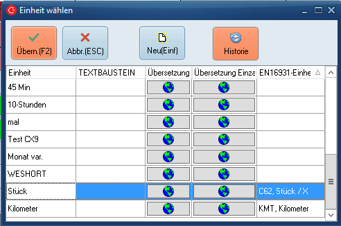 ACHTUNG, die Einheiten werden hier mit Codes abgekürzt. Dies ist extern vorgegeben.