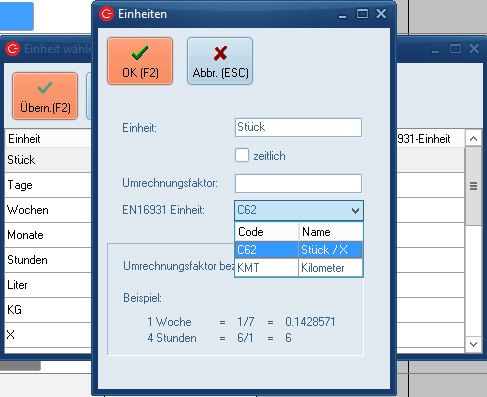 Hier müssen Kürzel für die E-Rechnung zugeordnet werden, über das Drop Down. aktuell muss hier Stück und KM befüllt werden. Die Tabelle wird noch ergänzt. (Einige Einheiten können nicht zugeordnet werden wie z.B. 3Stunden etc.)