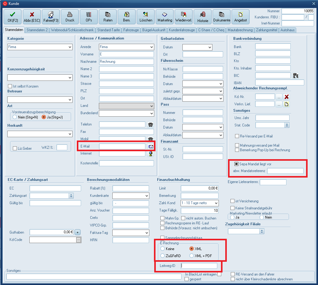 Im Kundenstamm müssen unbedingt die Felder Leitweg ID & E-Mail befüllt sein.