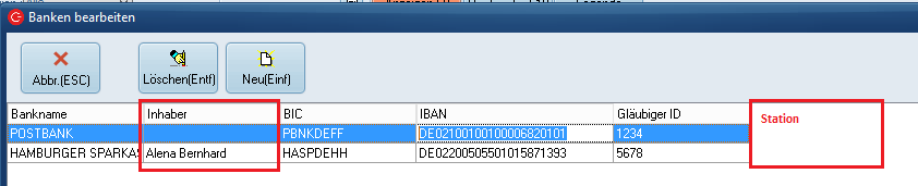> Stammdaten Station es zählen nur Einträge in Bank1 BIC IBAN // Bank 2 wird nicht verwendet.