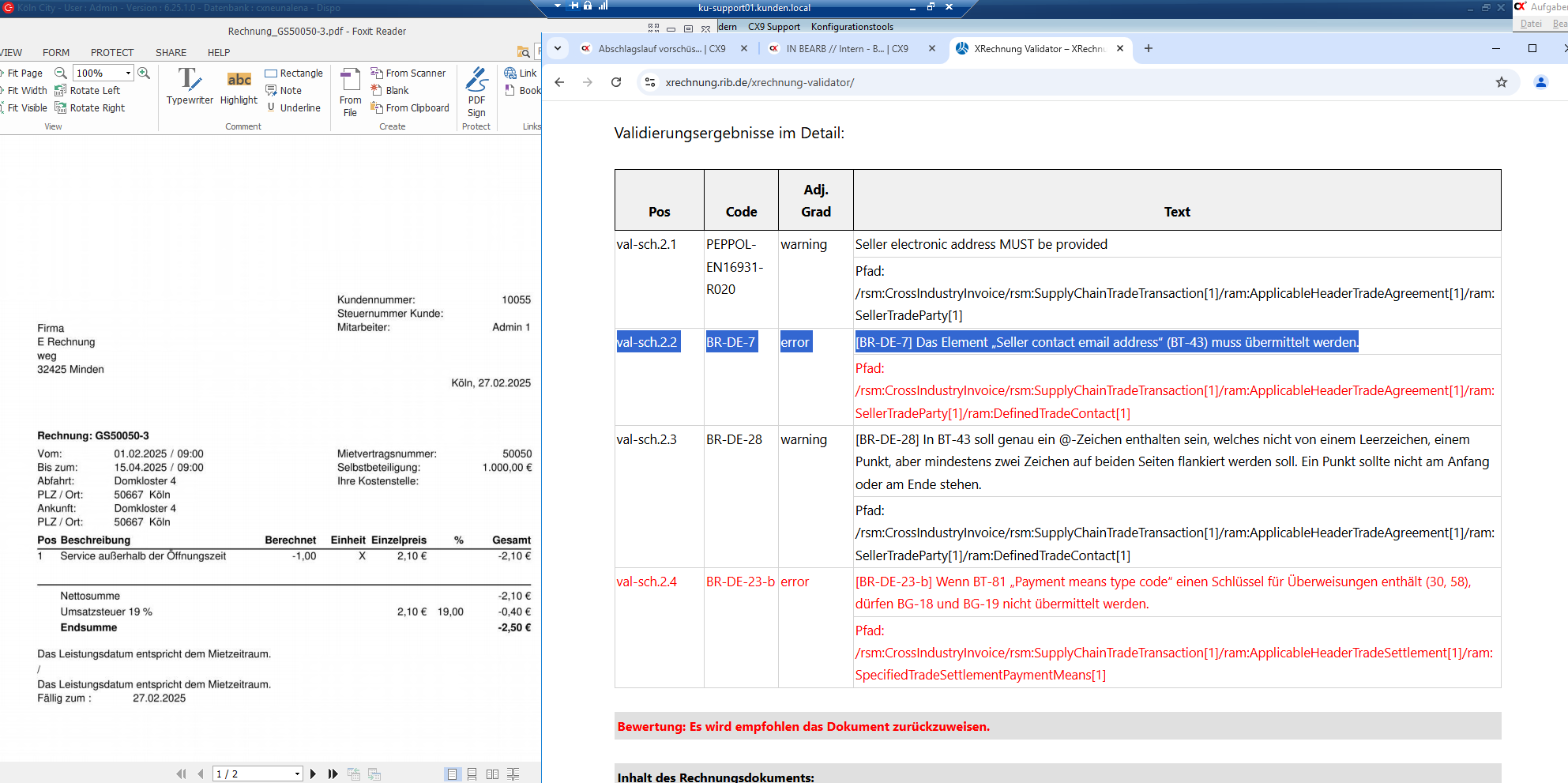 Abschlag & Abrechnung eines MV: RE 50049-11. Versendet an Deployment. ok2. Visualisierung, Abschlag wird nicht als solcher erkannt und wird mit typ 380 ausgegeben. Abrechnung wird auch nicht erkannt, kommt als typ GS raus... Dirk ist dran.Test 05.03.25 ok bei bereits gespeicherter Rechnung. Dirk schaut nochmal die Rechnungserzeugung an.Test RE ohne MV: RE10093Test ok.->> Test hier erstmal mit Dirk eingestellt. Geht hier am TT.MM weiter.27.02.25Test Sammelrechnungmit Station 004 & mit Ausdruck Druck Sammelrechnung-> hier kommt nur eine Vertragsnummer und Abrechnungzeitraum im Visualizierer an (die erste). Frage ob wir das umsetzen wollen oder nicht. Re 1094. Feld BT-12. Dirk ist dran. Zusätzlich kann es zur weiteren Problemen kommen, wenn Verträge aus mehreren Stationen (keine Auswahl im Feld) Rechnungen erstellt werden (Thema welche Bank aus Station genutzt wird - ggf. Zentrale würde ich vorschlagen). Dirk hält hierzu auch RS mit MUHR und ARNDT. Wir vermuten das Kunden mit abweichenden Banken in Stationen weder die Sammelrechnung nicht den Abschlag für alle Stationen gleichzeitig ausführen. Hier vermuten wir das eh immer jede Station einzeln erstellt wird.IDEE zur Programmierung: Der Haken Sammelrechnung in Maske Sammelrechnung oder Abschlag wird gesperrt, wenn alle Stationen ausgewählt werden, dann ist nur noch der Einzeldruck der RE möglich.-> 04.03. RS TS: bei Sammelrechnung gibt es keine E-Rechnung, nur bei Einzelrechnung. Siehe Link.https://www.gotomaxx.com/pdf-blog/sammelrechnungen-nach-der-e-rechnungspflicht/Test Abschlagslauf1. Fehler bei Faktorierung RE50041 (3. XML mit PDF) Fehlercode:beim Verbinden mit:https://kunden2.cx9.de/cxneunalena/crentweb/classes/PUniversell.php?reno=RE50041-05.03. Test ok2. RE 50050-1 (2. XML) Visualizierer zeigt Abrechnungszeitraum 1.2.2025 / 15.4.2025. lt. RE: Anteilige Abrechnung vom 01.02.2025 bis einschließlich 28.02.2025 // Unter Details steht im Visualizierer Abrechnungszeitraum 1.2.2025-1.3.2025-> 05.03. Test okWas ist mit Textzusätzen, "Zahlbar ohne Abzug unter Angabe der Rechnungsnummer" Hier könnte aber auch stehen:" bis TT.MM zahlbar mit 3 % Skonto". Dirk klärt das mit MUHR, ARNDT und oder CEUSTER.-> 04.03. RS TS: Zahlungstext (für Skonto) über Textfeld/Freitexthttps://faktoora.com/alle-felder-der-xrechnung-einfach-und-uebersichtlich-erklaert/-> 05.03. Test okTest Rechnungsläufe1. RE 50051-1 KD hat 2. XML. Mail kommt mit Datei PDF-> 05.03. Test ok im Virsuliser, bei Dirk wird aber noch ein Fehler angezeigt. Darum kümmert er sich noch.2. RE60009-2 KD hat 4. XML & PDF->> Beide Mails kommen als PDF beim Kunden an. Dirk ist dran.(Druckt man über die Maske Rechnung erneut per Mail dann ist der Anhang korrekt.-> 04.03. RS DH, Dirk hat das nachgetragen (units). Sollte im nächsten Test ggf. funktionieren.-> 05.03. Test noch nicht ok. kommt noch als PDF.Test KFZ Rechnung->KD 10001 // RE1100hier fehlt der gezahlte Betrag. BT-113 muss Zahlung stehen, BT-115 fälliger Betrag muss dann angepasst sein.-> KD 10055 ok-> 04.03. RS DH, Dirk hat das bearbeitet. Sollte im nächsten Test ggf. funktionieren.-> 05.03. Test noch nicht ok. Zahlung kommt noch nicht anTest Schadenrechnung-> RE70003-5 KD 10001 4. XML & PDF, kommt nur als PDF raus.-> 04.03. RS DH, Dirk hat das nachgetragen (statische Daten). Sollte im nächsten Test ggf. funktionieren.bei nicht eingetragener Zahlart einen Fallback von Dirk nutzen.-> 05.03. Test okTest RE Strafmandate-> KD 10055 RE50051-2 // Teilzahlung 5€ wird nicht erkannt/ausgewiesen im Virtulizer.-> KD 10001 RE50041-3 // Überzahlungwird nicht erkannt/ausgewiesen im Virtulizer.-> 04.03. RS DH, Dirk hat dasbearbeitet. Sollte im nächsten Test ggf. funktionieren.Test Gutschrift-> KD 10001 GS50041-3 GS mit -15€ //im Virtulizer. fehlt der Block mit Zahlungsinfos (Betrag, Steuerschlüssel, Rate Einheit und es gibt keine Details.-> KD 10055 GS50050-4//im Virtulizer. fehlt der Block mit Zahlungsinfos (Betrag, Steuerschlüssel, Rate Einheit und es gibt keine Details. ggf. normal??-> 04.03. RS DH, Dirk kann das noch nicht genau sagen. Ist noch dran-> 05.03. Test keine Veränderung.Test Vermittlergutschrift-> Lief. 70001 XML & PDF VGS1007 // Datei kommt nur als PDF raus-> 04.03. RS DH, Dirk kann das noch nicht genau sagen. Ist noch dran.-> 05.03. Test keine Veränderung.Mautrechnung-> KD 10001 RE10220-1 ok (Tank)-> KD 10055 RE10221-1 ok (MAUT)Test Zusatzrechnung-> KD 10055 RE50050-3 // ok-> KD 10001 RE50041-4 // okTest Ausbuchung-> KD 10055 GS50050-3//im Virtulizer. fehlt der Block mit Zahlungsinfos (Betrag, Steuerschlüssel, Rate Einheit und es gibt keine Details.ggf. normal??-> KD 10001 GS50041-3//im Virtulizer. fehlt der Block mit Zahlungsinfos (Betrag, Steuerschlüssel, Rate Einheit und es gibt keine Details.ggf. normal??Dirk ist dran-> 04.03. RS DH, Dirk kann das noch nicht genau sagen. Ist noch dran-> 05.03. Test keine Veränderung.Test SEPA-> AB 28.02.25 okWKZ Abrechnung?-> AB 28.02. keine Ahnung wie ich das erstellen kann.-> 04.03. TSüber Verkauf Rechnungen ist nur eine Liste. Das hat also keine Relevanz für E-Rechnungen.WKZ Rechnung über KFZ Stamm-> 04.03. RS TS, ist dran. Wir benötigen für den Test auf jeden Fall eine neue Rate, eine eine normale Zusatzrate.