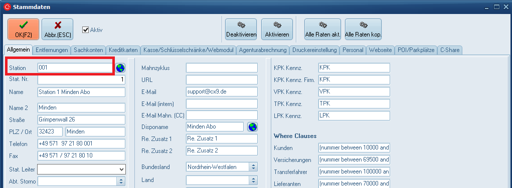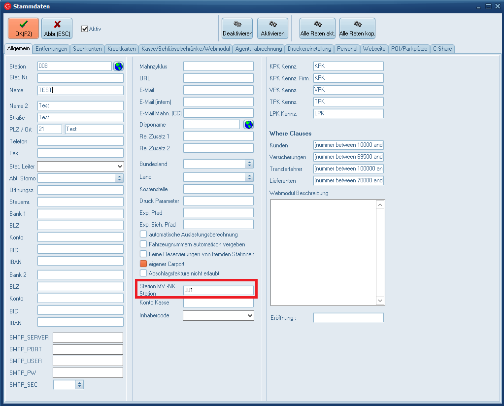 - In der Filiale, im Register "Allgemein", muss das Feld "StationMV.-NK. Station" enthalten sein. Dies ist ab Version 6.0 der Fall.