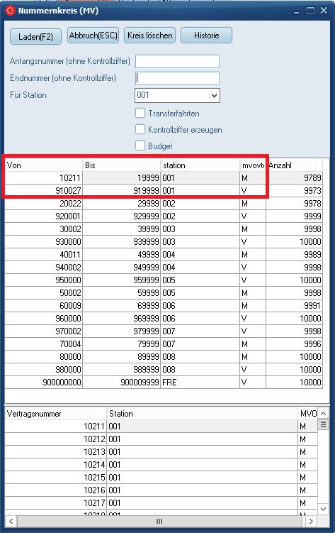 Der Nummernkreis für Station 001 ist z.B. wie folgt angelegt (M steht für Mietverträge, V für Transferfahrten)