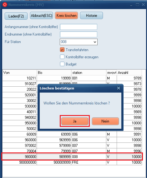 Der Nummernkreis für Transferfahrten wurde erfolgreich gelöscht.
