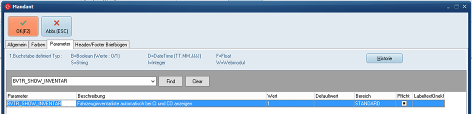 1. Parameter BVTR_SHOW_INVENTAR - Fahrzeuginventarliste automatisch bei CI und CO anzeigen - muss aktiv sein (1 in Spalte Wert eintragen):