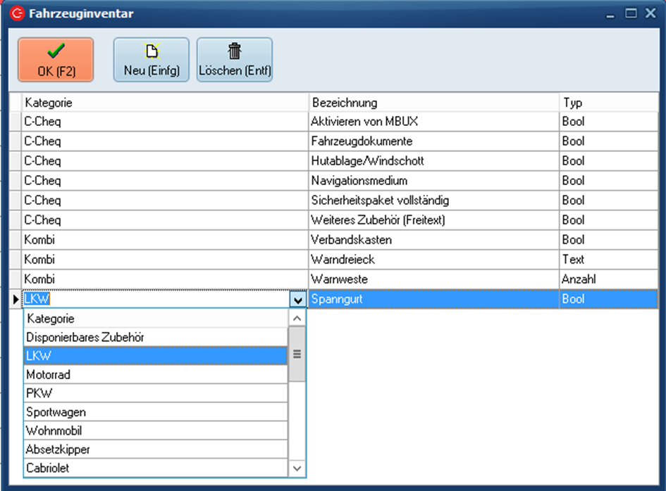 - Typ= hier kann standardmäßig "Bool" hinterlegt werden. (Die Typen "Anzahl" und "Text" werden nur in Zusammenhang mit dem Modul COCI benötigt, damit man eine entsprechende Anzahl oder einen Freitext im COCI-Modul erfassen kann. In C-Rent und C-Cheq sind diese Eingaben aber immer typenunabhängig möglich.)