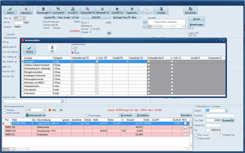 Die eingestellten Inventare werden nun in der Vertragsmaske bei CI und CO angezeigt.
