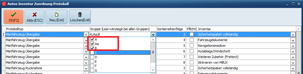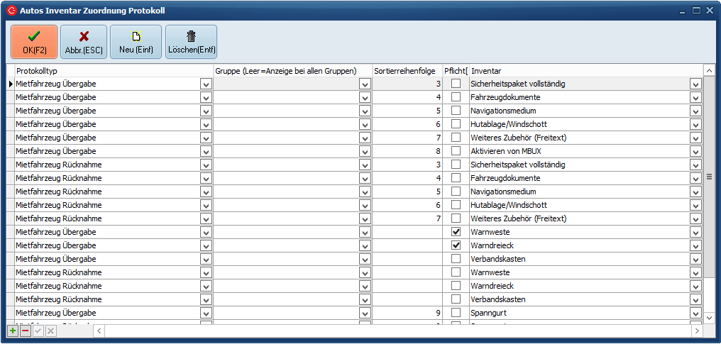 Protokolltyp = Für die Inventare der Autos im C-Rent reicht es aus den Protokolltyp "Mietfahrzeuge Übergabe" einzustellen. Für jedes Inventar erstellt man eine neue Zeile mit dem Typ "Mietfahrzeuge Übergabe".